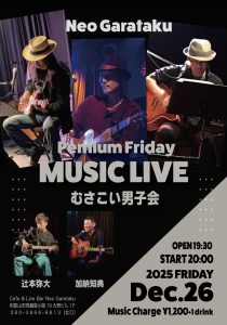 Home むさこい男子会 Premium Friday Music Live むさこい男子会 Premium Friday Music Live 2025.11.16 Tweet イベント詳細 日付: 2025年12月26日 20:00 – 22:30 出演:むさこい男子会、辻本奨太、加納知典 OPEN 19:30 / START 20:00 Music Charge ¥1,200+1drink Tweet Facebook 最新情報はコチラから★ Cafe & Live Bar Neo Garataku Category info お知らせ メニュー ライブ情報 最新記事 2020.03.25 ライブ情報 年間イベント一覧 2020.03.25 メニュー ドリンクメニュー 2018.10.02 メニュー カフェメニュー 2018.10.02 メニュー フードメニュー 2018.10.01 info ユニット紹介