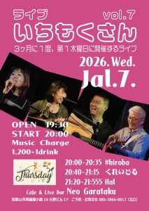 Home 新年!いちもくさん vol.7 新年!いちもくさん vol.7 2026.01.1 Tweet イベント詳細 日付: 2026年1月7日 20:00 – 22:00 出演:#hiroba、くれいどる、Hal OPEN 19:30 / START 20:00 Music Charge ¥1,200+1drink Tweet Facebook 最新情報はコチラから★ Cafe & Live Bar Neo Garataku Category info お知らせ メニュー ライブ情報 最新記事 2020.03.25 ライブ情報 年間イベント一覧 2020.03.25 メニュー ドリンクメニュー 2018.10.02 メニュー カフェメニュー 2018.10.02 メニュー フードメニュー 2018.10.01 info ユニット紹介
