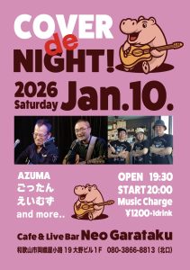 Home カバーdeナイト!2026 カバーdeナイト!2026 2026.01.1 Tweet イベント詳細 日付: 2026年1月10日 20:00 – 22:30 出演:AZUMA、ごったん、えいむず、and more.. OPEN 19:30 / START 20:00 Music Charge ¥1,200+1drink Tweet Facebook 最新情報はコチラから★ Cafe & Live Bar Neo Garataku Category info お知らせ メニュー ライブ情報 最新記事 2020.03.25 ライブ情報 年間イベント一覧 2020.03.25 メニュー ドリンクメニュー 2018.10.02 メニュー カフェメニュー 2018.10.02 メニュー フードメニュー 2018.10.01 info ユニット紹介