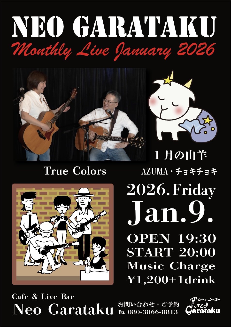 Home ネオガラタクマンスリーライブ〜1月の山羊〜 ネオガラタクマンスリーライブ〜1月の山羊〜 2026.01.1 Tweet イベント詳細 日付: 2026年1月9日 20:00 – 22:30 出演:True Colors、AZUMA、チョキチョキ OPEN 19:30 / START 20:00 Music Charge ¥1,200+1drink Tweet Facebook 最新情報はコチラから★ Cafe & Live Bar Neo Garataku Category info お知らせ メニュー ライブ情報 最新記事 2020.03.25 ライブ情報 年間イベント一覧 2020.03.25 メニュー ドリンクメニュー 2018.10.02 メニュー カフェメニュー 2018.10.02 メニュー フードメニュー 2018.10.01 info ユニット紹介