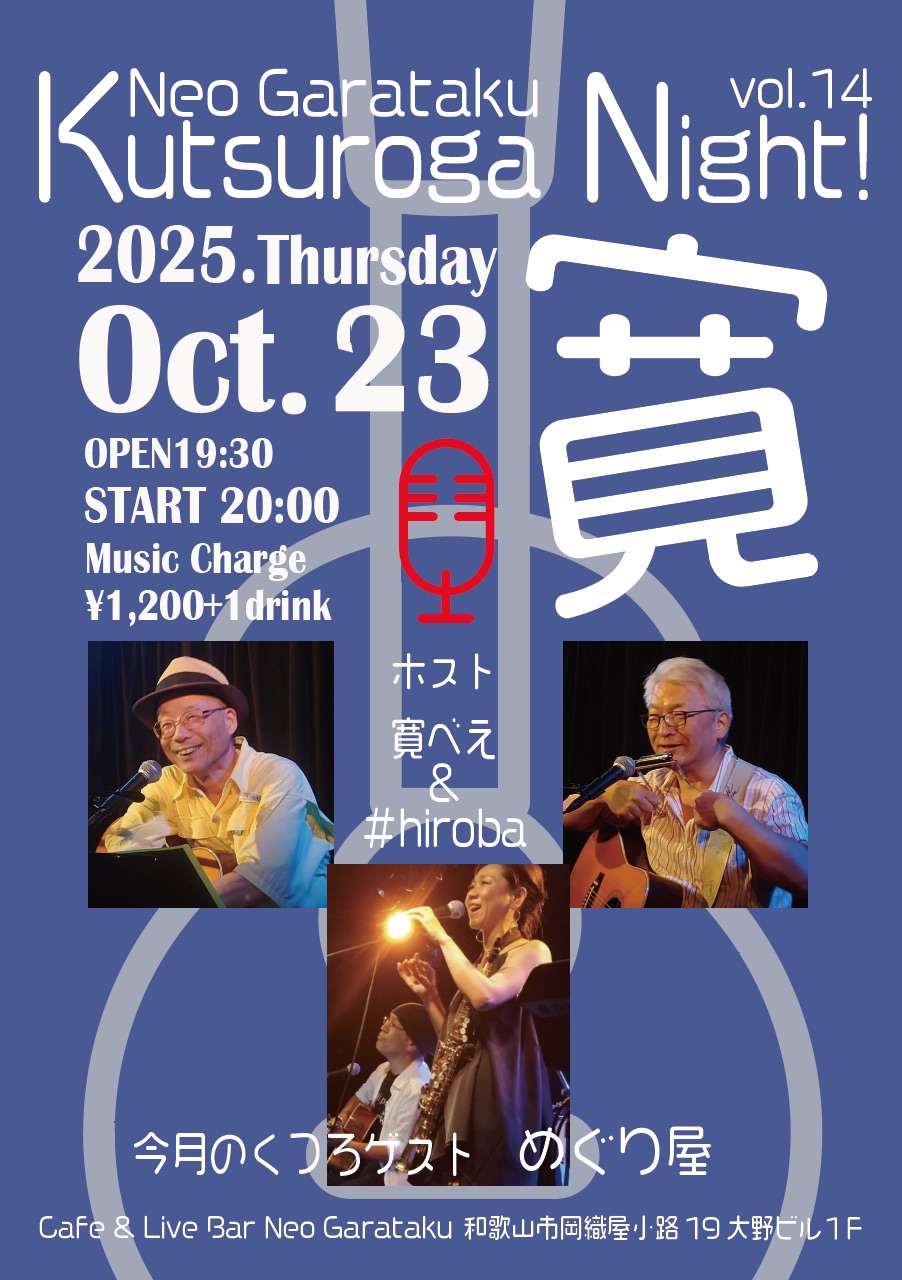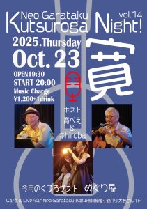 Home Kutsuroga Night! vol.14 Kutsuroga Night! vol.14 2025.10.1 Tweet イベント詳細 日付: 2025年10月23日 20:00 – 22:30 出演:寛べえ、#hiroba、めぐり屋 OPEN 19:30 START 20:00 Music Charge ¥1,200+1drink Tweet Facebook 最新情報はコチラから★ Cafe & Live Bar Neo Garataku Category info お知らせ メニュー ライブ情報 最新記事 2020.03.25 ライブ情報 年間イベント一覧 2020.03.25 メニュー ドリンクメニュー 2018.10.02 メニュー カフェメニュー 2018.10.02 メニュー フードメニュー 2018.10.01 info ユニット紹介
