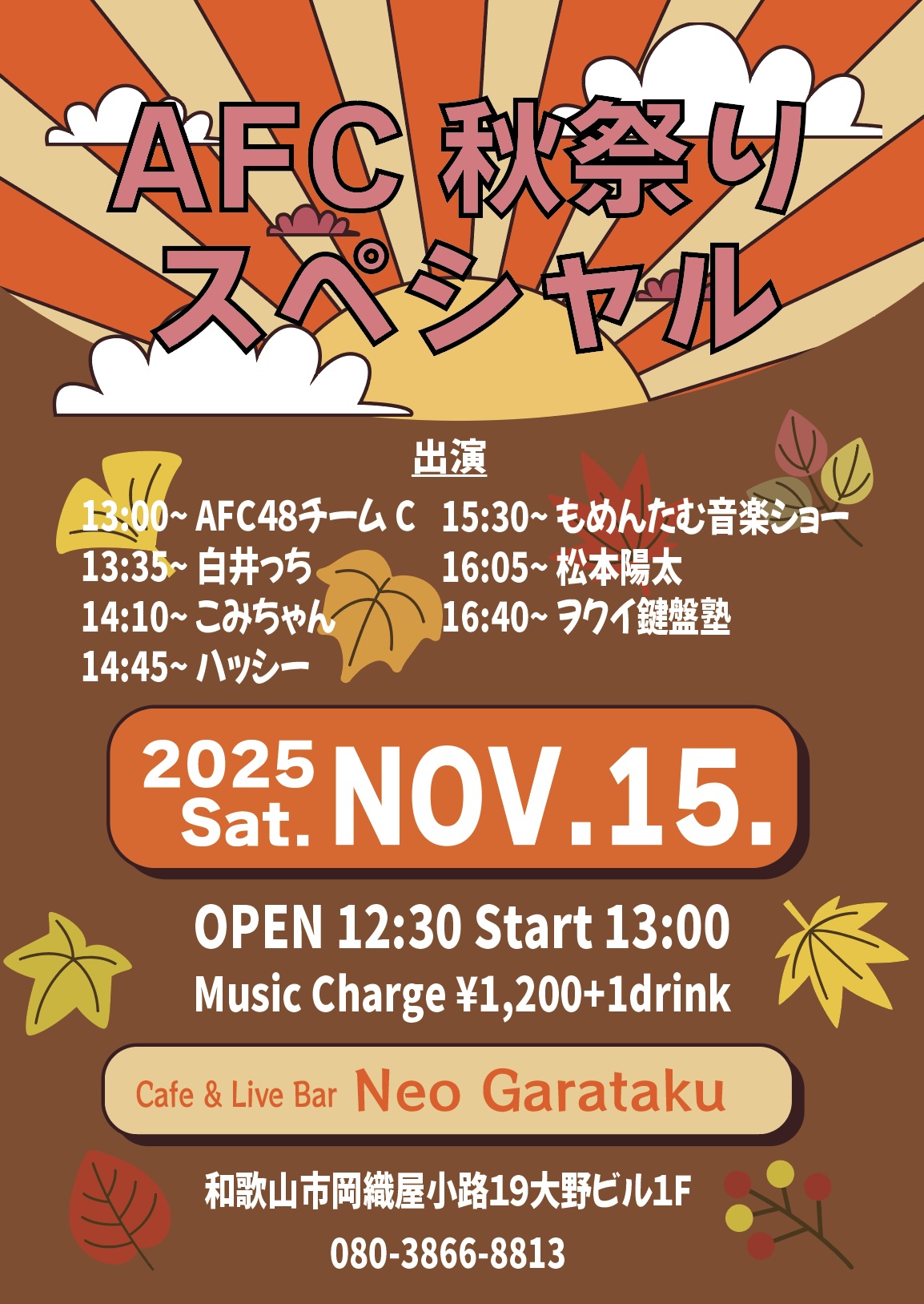 Home AFC 秋祭りスペシャル AFC 秋祭りスペシャル 2025.10.27 Tweet イベント詳細 日付: 2025年11月15日 13:00 – 17:00 出演:AFC48チームC、白井っち、こみちゃん ハッシー、もめんたむ音楽ショー 松本陽太、ヲクイ鍵盤塾 OPEN 12:30 START 13:30 Music Charge ¥1,200+1drink Tweet Facebook 最新情報はコチラから★ Cafe & Live Bar Neo Garataku Category info お知らせ メニュー ライブ情報 最新記事 2020.03.25 ライブ情報 年間イベント一覧 2020.03.25 メニュー ドリンクメニュー 2018.10.02 メニュー カフェメニュー 2018.10.02 メニュー フードメニュー 2018.10.01 info ユニット紹介