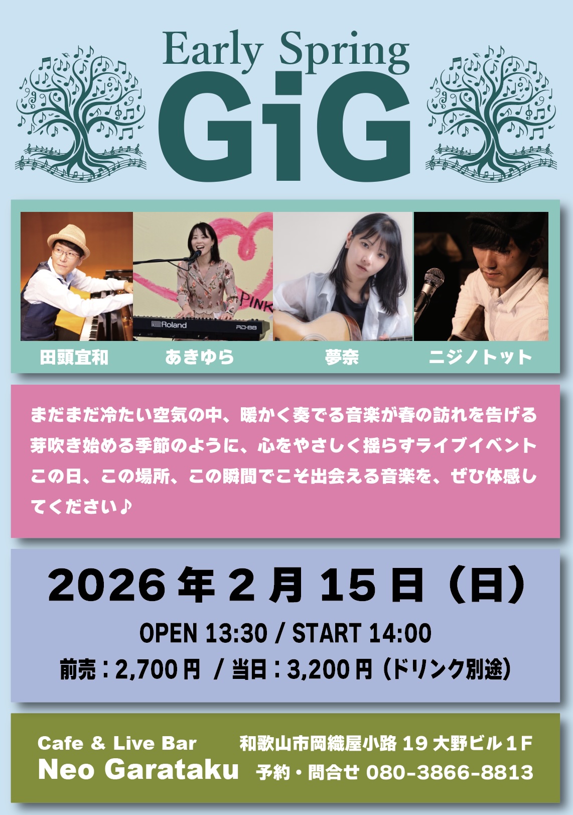 Home Early Spring GiG 2026 Early Spring GiG 2026 2026.01.18 Tweet イベント詳細 日付: 2026年2月15日 14:00 – 17:00 出演:田頭宜和、あきゆら、夢奈、ニジノトット OPEN 13:30 / START 14:00 前売:2,700円 / 当日:3,200円(ドリンク別途) Tweet Facebook 最新情報はコチラから★ Cafe & Live Bar Neo Garataku Category info お知らせ メニュー ライブ情報 最新記事 2020.03.25 ライブ情報 年間イベント一覧 2020.03.25 メニュー ドリンクメニュー 2018.10.02 メニュー カフェメニュー 2018.10.02 メニュー フードメニュー 2018.10.01 info ユニット紹介
