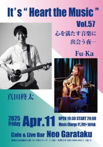 Home It’s “Heart the Music” vol.57 It’s “Heart the Music” vol.57 2025.04.2 Tweet イベント詳細 日付: 2025年4月11日 20:00 – 22:30 出演:真田柊太、Fu-Ka OPEN 19:30 START 20:00 Music Charge ¥1,700+1drink Tweet Facebook 最新情報はコチラから★ Cafe & Live Bar Neo Garataku Category info お知らせ メニュー ライブ情報 最新記事 2020.03.25 ライブ情報 年間イベント一覧 2020.03.25 メニュー ドリンクメニュー 2018.10.02 メニュー カフェメニュー 2018.10.02 メニュー フードメニュー 2018.10.01 info ユニット紹介