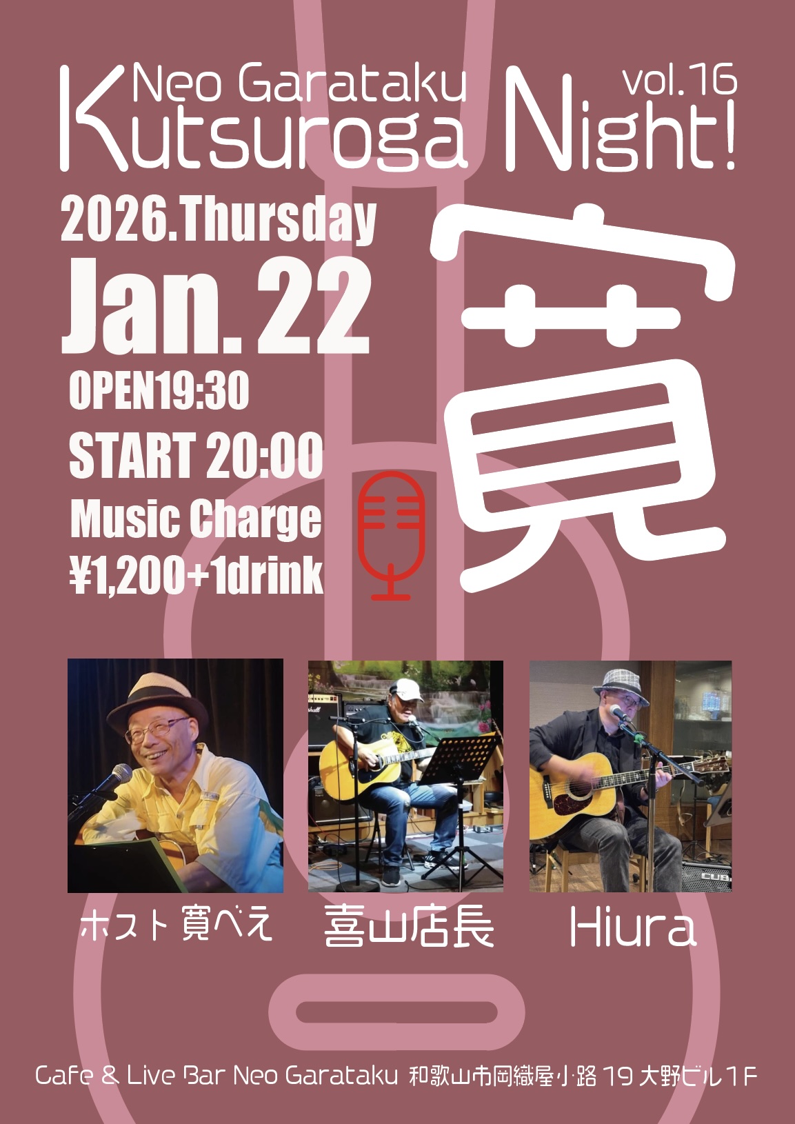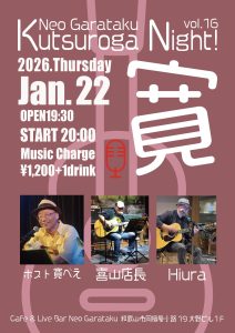 Home Kutsuroga Night vol.16 Kutsuroga Night vol.16 2026.01.1 Tweet イベント詳細 日付: 2026年1月22日 20:00 – 22:30 出演:寛べえ、喜山店長、Hiura OPEN 19:30 / START 20:00 Music Charge ¥1,200+1drink Tweet Facebook 最新情報はコチラから★ Cafe & Live Bar Neo Garataku Category info お知らせ メニュー ライブ情報 最新記事 2020.03.25 ライブ情報 年間イベント一覧 2020.03.25 メニュー ドリンクメニュー 2018.10.02 メニュー カフェメニュー 2018.10.02 メニュー フードメニュー 2018.10.01 info ユニット紹介