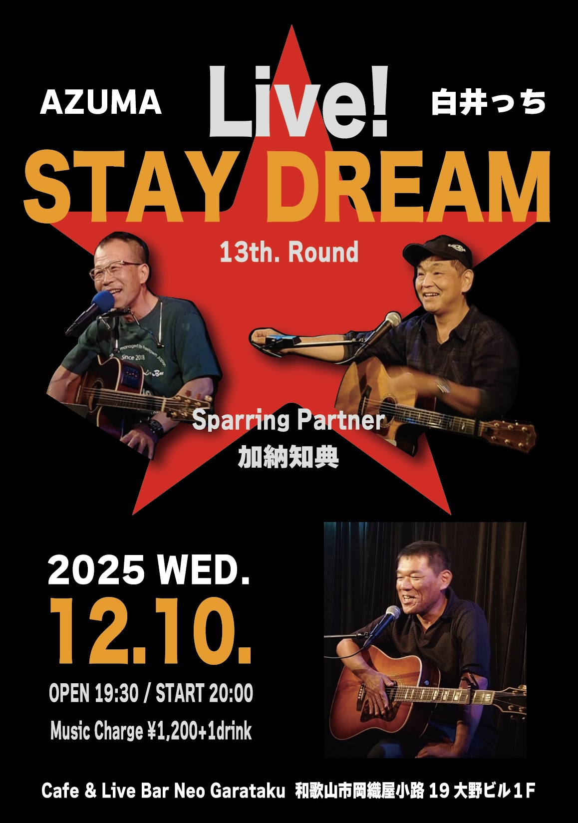 Home Live! STARY DREAM 13th Round Live! STARY DREAM 13th Round 2025.11.14 Tweet イベント詳細 日付: 2025年12月10日 20:00 – 22:30 出演:AZUMA、白井っち、加納知典 OPEN 19:30 / START 20:00 Music Charge ¥1,200+2drink Tweet Facebook 最新情報はコチラから★ Cafe & Live Bar Neo Garataku Category info お知らせ メニュー ライブ情報 最新記事 2020.03.25 ライブ情報 年間イベント一覧 2020.03.25 メニュー ドリンクメニュー 2018.10.02 メニュー カフェメニュー 2018.10.02 メニュー フードメニュー 2018.10.01 info ユニット紹介