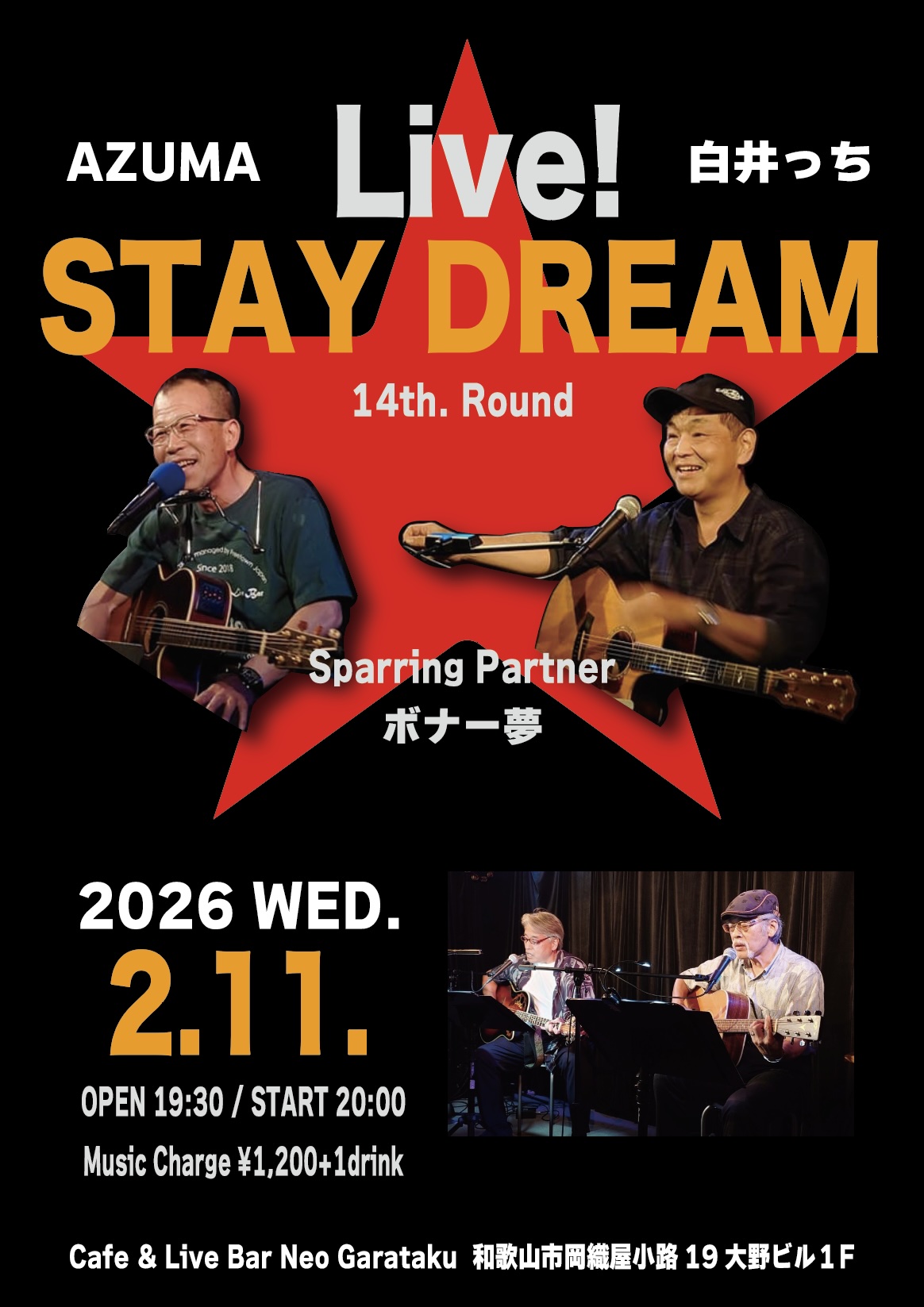 Home Live! STAY DREAM 14th round Live! STAY DREAM 14th round 2026.01.18 Tweet イベント詳細 日付: 2026年2月11日 20:00 – 22:30 出演:AZUMA、白井っち、ボナー夢 OPEN 19:30 / START 20:00 Music Charge ¥1,200+1drink Tweet Facebook 最新情報はコチラから★ Cafe & Live Bar Neo Garataku Category info お知らせ メニュー ライブ情報 最新記事 2020.03.25 ライブ情報 年間イベント一覧 2020.03.25 メニュー ドリンクメニュー 2018.10.02 メニュー カフェメニュー 2018.10.02 メニュー フードメニュー 2018.10.01 info ユニット紹介