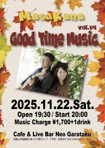 Home Masa Kana “GOOD TIME MUSIC” vol.14 Masa Kana “GOOD TIME MUSIC” vol.14 2025.10.27 Tweet イベント詳細 日付: 2025年11月22日 20:00 – 22:30 出演:MasaKana OPEN 19:30 START 20:00 Music Charge ¥1,700+1drink Tweet Facebook 最新情報はコチラから★ Cafe & Live Bar Neo Garataku Category info お知らせ メニュー ライブ情報 最新記事 2020.03.25 ライブ情報 年間イベント一覧 2020.03.25 メニュー ドリンクメニュー 2018.10.02 メニュー カフェメニュー 2018.10.02 メニュー フードメニュー 2018.10.01 info ユニット紹介