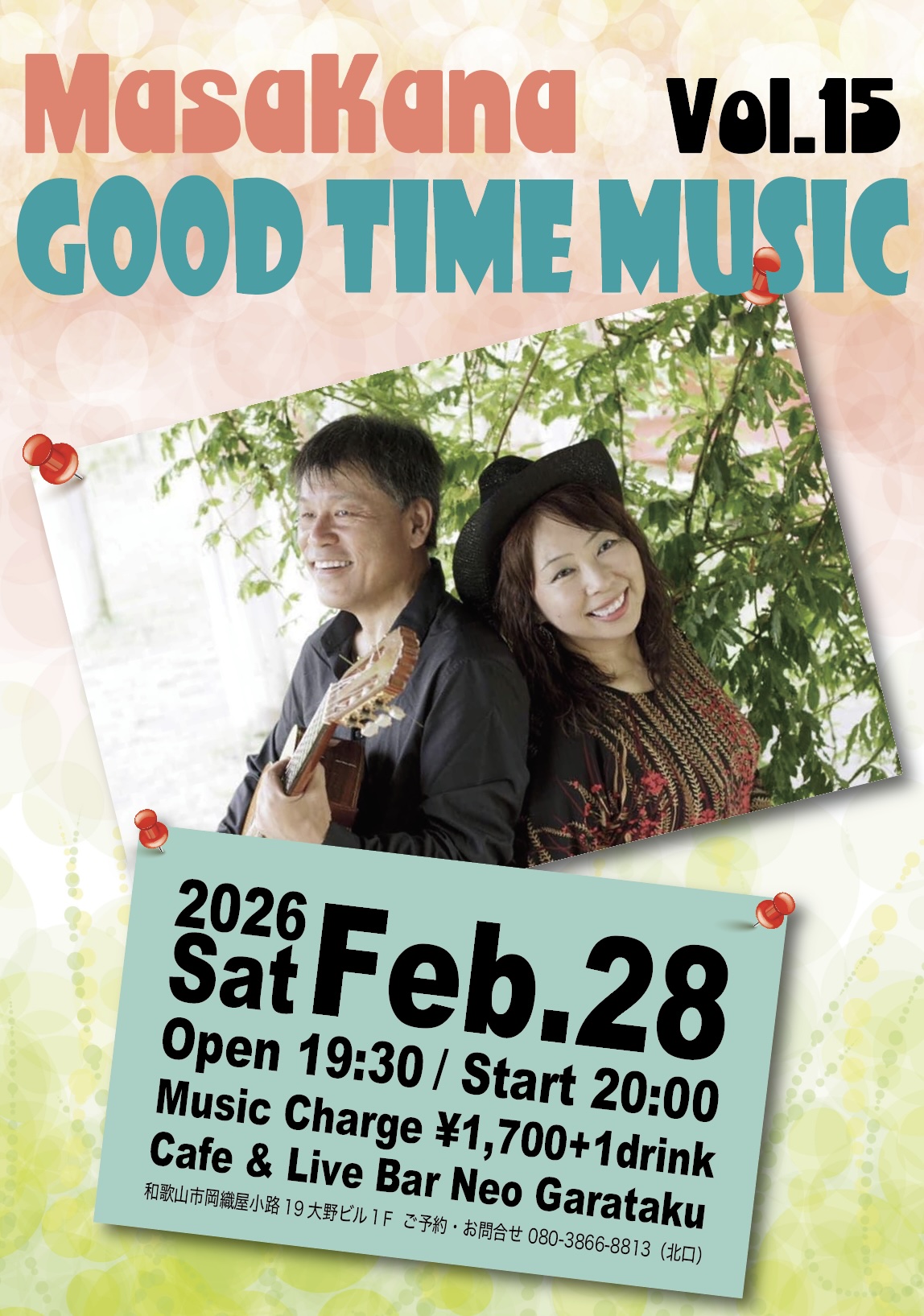 Home MasaKana GOOD TIME MUSIC vol.15 MasaKana GOOD TIME MUSIC vol.15 2026.01.18 Tweet イベント詳細 日付: 2026年2月28日 20:00 – 22:00 出演:Masakana OPEN 19:30 / START 20:00 Music Charge ¥1,700+1drink Tweet Facebook 最新情報はコチラから★ Cafe & Live Bar Neo Garataku Category info お知らせ メニュー ライブ情報 最新記事 2020.03.25 ライブ情報 年間イベント一覧 2020.03.25 メニュー ドリンクメニュー 2018.10.02 メニュー カフェメニュー 2018.10.02 メニュー フードメニュー 2018.10.01 info ユニット紹介