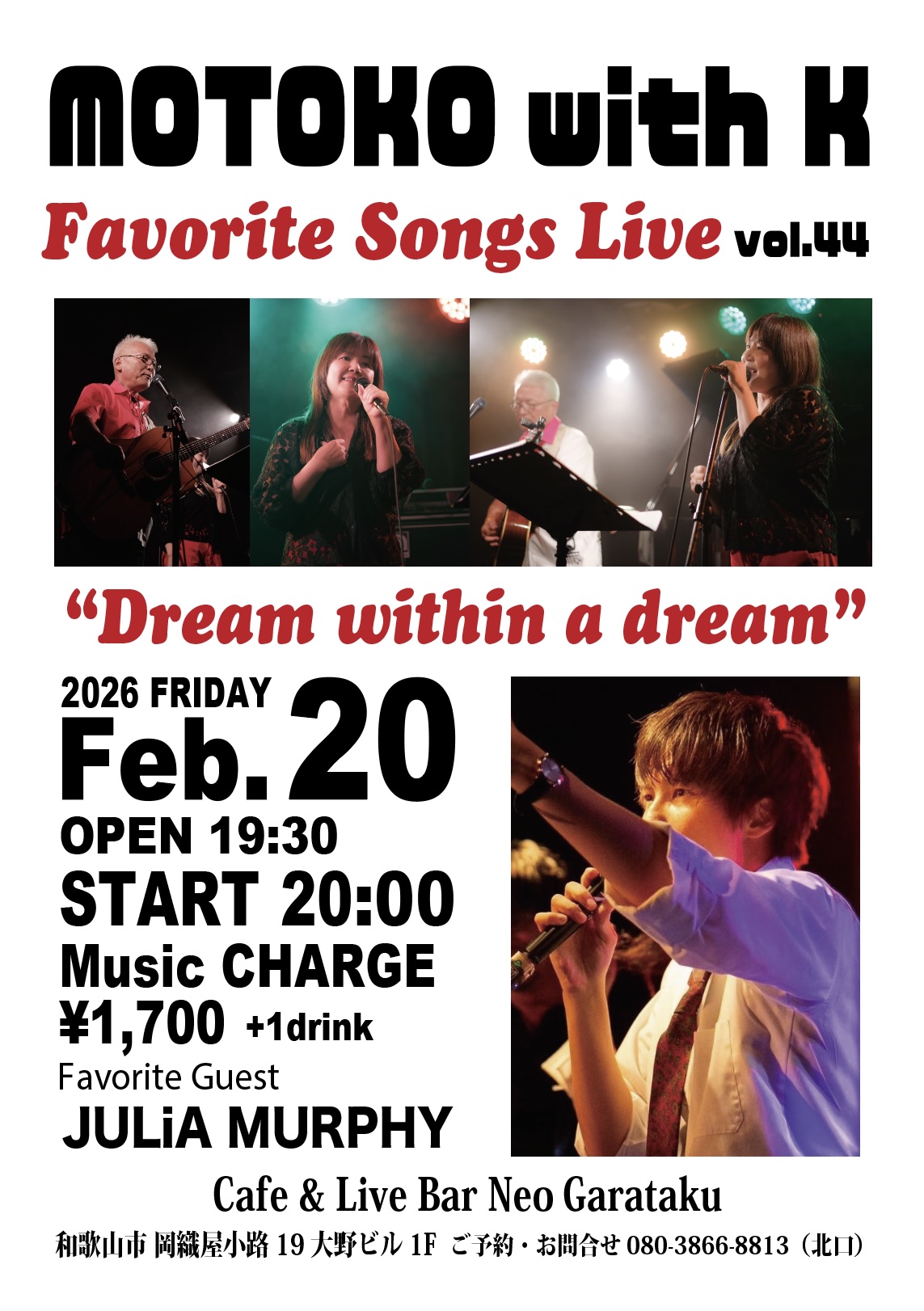 Home Motoko with K Favorite Songs Live Motoko with K Favorite Songs Live 2026.01.18 Tweet イベント詳細 日付: 2026年2月20日 20:00 – 22:30 出演:Motoko with K、JULiA MURPHY OPEN 19:30 / START 20:00 Music Charge ¥1,700+1drink Tweet Facebook 最新情報はコチラから★ Cafe & Live Bar Neo Garataku Category info お知らせ メニュー ライブ情報 最新記事 2020.03.25 ライブ情報 年間イベント一覧 2020.03.25 メニュー ドリンクメニュー 2018.10.02 メニュー カフェメニュー 2018.10.02 メニュー フードメニュー 2018.10.01 info ユニット紹介