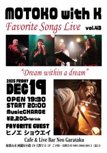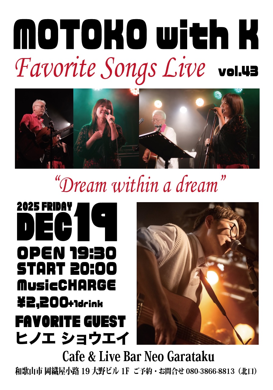 Home Motoko with K Favorite Songs Live vol.43 Motoko with K Favorite Songs Live vol.43 2025.11.16 Tweet イベント詳細 日付: 2025年12月19日 20:00 – 22:30 出演:Motoko with K、ヒノエショウエイ OPEN 19:30 / START 20:00 Music Charge ¥2,200+1drink Tweet Facebook 最新情報はコチラから★ Cafe & Live Bar Neo Garataku Category info お知らせ メニュー ライブ情報 最新記事 2020.03.25 ライブ情報 年間イベント一覧 2020.03.25 メニュー ドリンクメニュー 2018.10.02 メニュー カフェメニュー 2018.10.02 メニュー フードメニュー 2018.10.01 info ユニット紹介