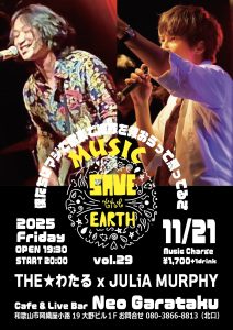 Home Music Save the Earth! vol.20 Music Save the Earth! vol.20 2025.10.27 Tweet イベント詳細 日付: 2025年11月21日 20:00 – 22:00 出演:THE★わたる、JULiA MURPHY OPEN 19:30 / START 20:00 Music Charge ¥1,200+1drink Tweet Facebook 最新情報はコチラから★ Cafe & Live Bar Neo Garataku Category info お知らせ メニュー ライブ情報 最新記事 2020.03.25 ライブ情報 年間イベント一覧 2020.03.25 メニュー ドリンクメニュー 2018.10.02 メニュー カフェメニュー 2018.10.02 メニュー フードメニュー 2018.10.01 info ユニット紹介