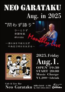 Home Neo Garataku Monthly Live Neo Garataku Monthly Live 2025.07.29 Tweet イベント詳細 日付: 2025年8月1日 20:00 – 22:00 出演:#hiroba OPEN 19:30 START 20:00 Music Charge ¥1,200+1drink Tweet Facebook 最新情報はコチラから★ Cafe & Live Bar Neo Garataku Category info お知らせ メニュー ライブ情報 最新記事 2020.03.25 ライブ情報 年間イベント一覧 2020.03.25 メニュー ドリンクメニュー 2018.10.02 メニュー カフェメニュー 2018.10.02 メニュー フードメニュー 2018.10.01 info ユニット紹介