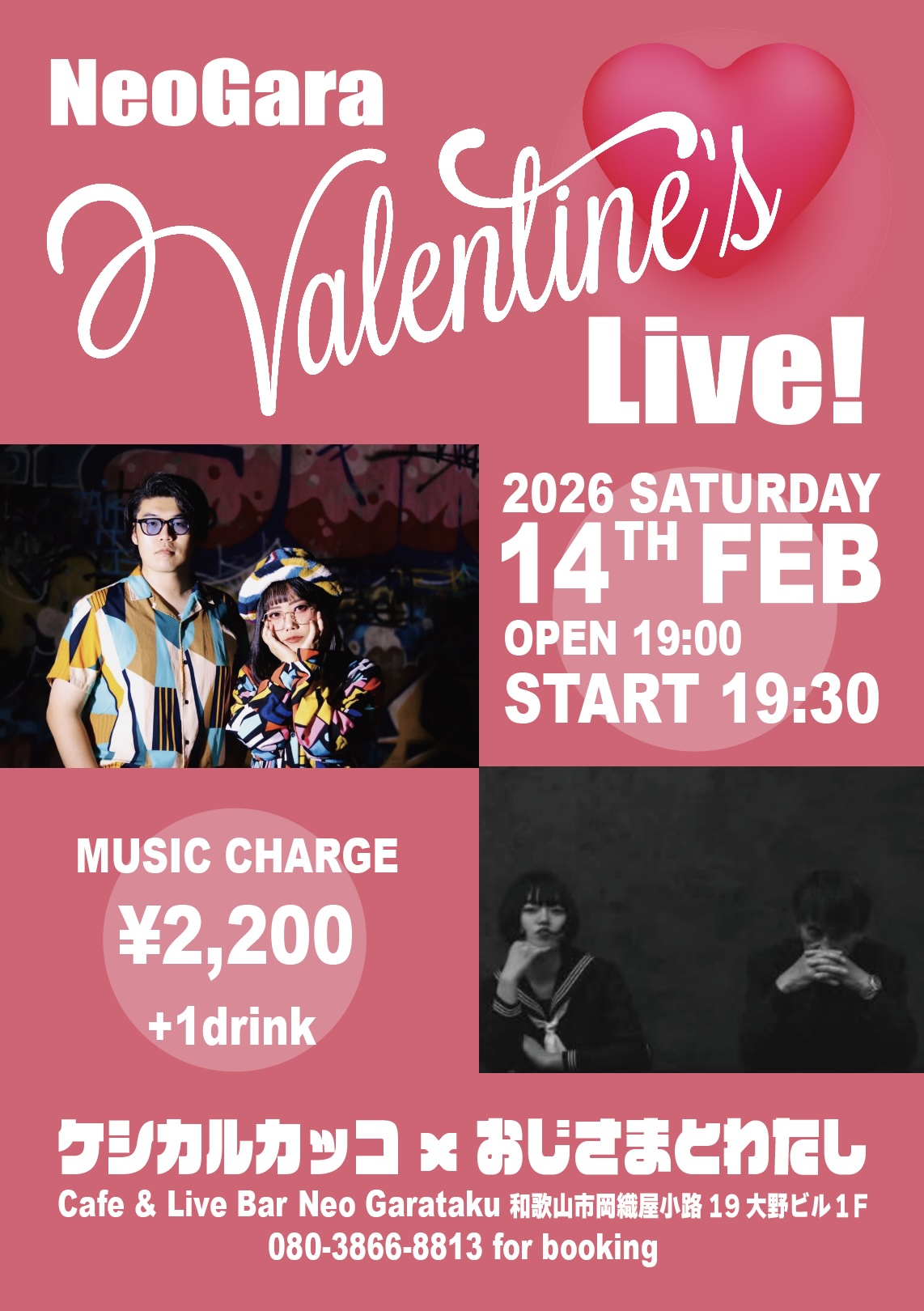 Home NeoGara Valentine’s Live! NeoGara Valentine’s Live! 2026.01.22 Tweet イベント詳細 日付: 2026年2月14日 19:30 – 21:30 出演:ケシカルカッコ、おじさまとわたし OPEN 19:00 / START 19:30 Music Charge ¥2,200+1drink Tweet Facebook 最新情報はコチラから★ Cafe & Live Bar Neo Garataku Category info お知らせ メニュー ライブ情報 最新記事 2020.03.25 ライブ情報 年間イベント一覧 2020.03.25 メニュー ドリンクメニュー 2018.10.02 メニュー カフェメニュー 2018.10.02 メニュー フードメニュー 2018.10.01 info ユニット紹介