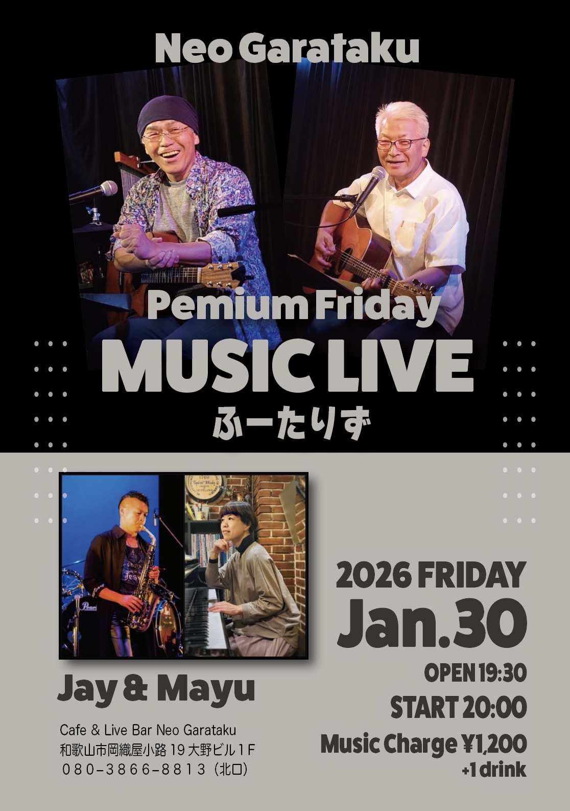Home Premium Friday Music Live ~ふーたりず~ Premium Friday Music Live ~ふーたりず~ 2026.01.1 Tweet イベント詳細 日付: 2026年1月30日 20:00 – 22:00 出演:ふーたりず、Jay & Mayu OPEN 19:30 / START 20:00 Music Charge ¥1,200+1drink Tweet Facebook 最新情報はコチラから★ Cafe & Live Bar Neo Garataku Category info お知らせ メニュー ライブ情報 最新記事 2020.03.25 ライブ情報 年間イベント一覧 2020.03.25 メニュー ドリンクメニュー 2018.10.02 メニュー カフェメニュー 2018.10.02 メニュー フードメニュー 2018.10.01 info ユニット紹介