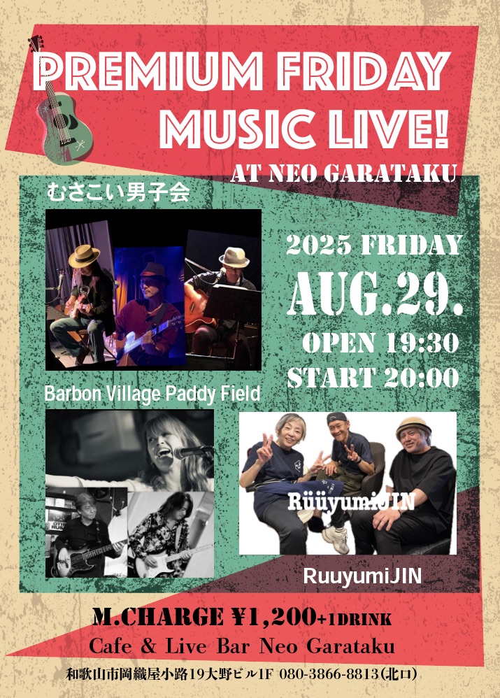 Home Premium Friday Music Live Premium Friday Music Live 2025.07.30 Tweet イベント詳細 日付: 2025年8月29日 20:00 – 22:30 出演:むさこい男子会、RuuyumiJIN Barbon Village Paddy Field OPEN 19:30 START 20:00 Music Charge ¥1,200*1drink Tweet Facebook 最新情報はコチラから★ Cafe & Live Bar Neo Garataku Category info お知らせ メニュー ライブ情報 最新記事 2020.03.25 ライブ情報 年間イベント一覧 2020.03.25 メニュー ドリンクメニュー 2018.10.02 メニュー カフェメニュー 2018.10.02 メニュー フードメニュー 2018.10.01 info ユニット紹介