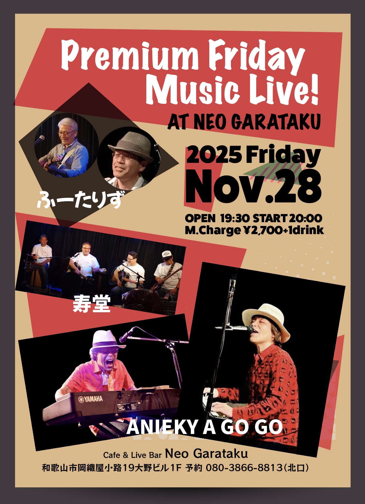 Home Premium Friday Music Live! Premium Friday Music Live! 2025.10.27 Tweet イベント詳細 日付: 2025年11月28日 20:00 – 22:30 出演:ふーたりず、寿堂 スペシャルゲスト:ANIEKY A GO GO OPEN 19:30 START 20:00 Music Charge ¥2,700+1drink Tweet Facebook 最新情報はコチラから★ Cafe & Live Bar Neo Garataku Category info お知らせ メニュー ライブ情報 最新記事 2020.03.25 ライブ情報 年間イベント一覧 2020.03.25 メニュー ドリンクメニュー 2018.10.02 メニュー カフェメニュー 2018.10.02 メニュー フードメニュー 2018.10.01 info ユニット紹介
