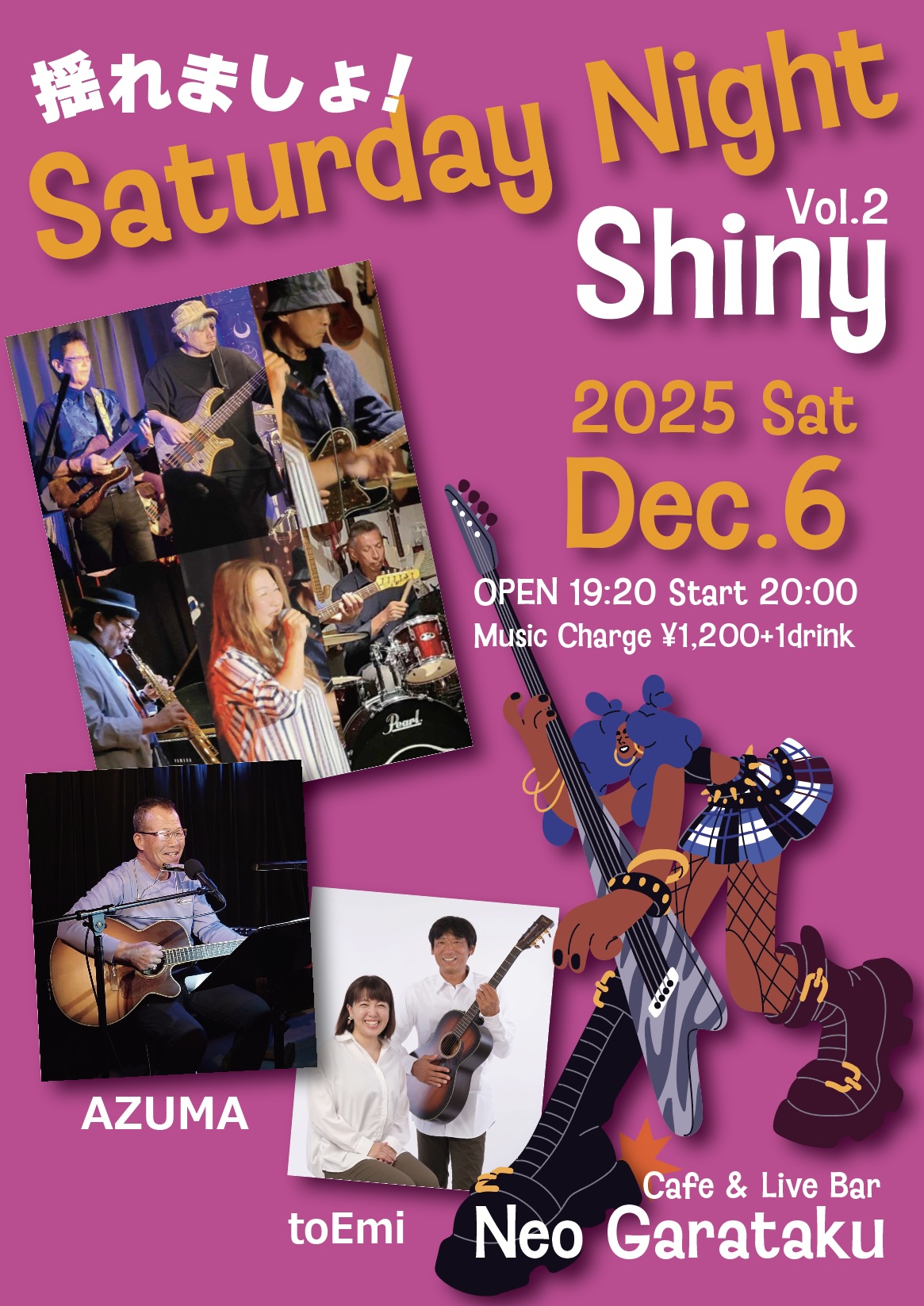 Home Saturday Night Shiny vol.2 Saturday Night Shiny vol.2 2025.11.14 Tweet イベント詳細 日付: 2025年12月6日 20:00 – 22:30 出演:Shiny、AZUMA、toEmi OPEN 19:30 / START 20:00 Music Charge ¥1,200+1drink Tweet Facebook 最新情報はコチラから★ Cafe & Live Bar Neo Garataku Category info お知らせ メニュー ライブ情報 最新記事 2020.03.25 ライブ情報 年間イベント一覧 2020.03.25 メニュー ドリンクメニュー 2018.10.02 メニュー カフェメニュー 2018.10.02 メニュー フードメニュー 2018.10.01 info ユニット紹介